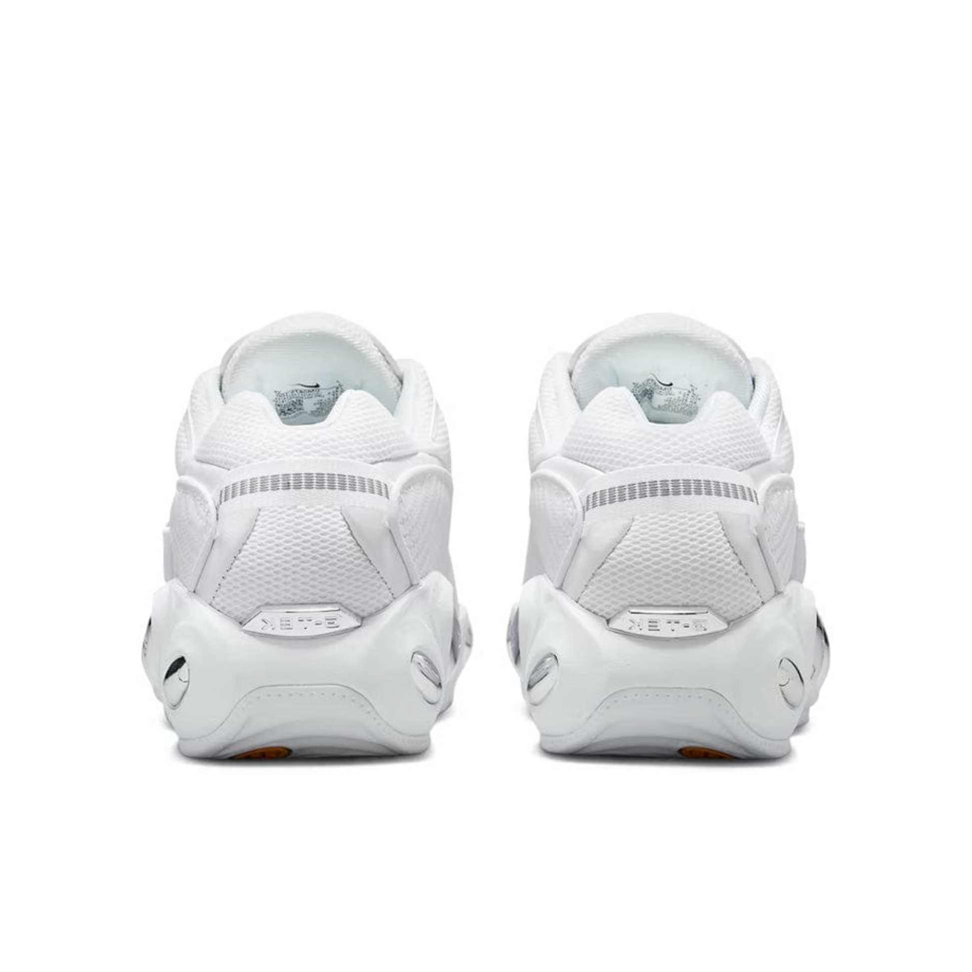 The upcoming "White Chrome" model, inspired by the Nike Zoom Flight 95, features breathable mesh and tonal white woven textile uppers. Circular chrome silver accents are incorporated into the unique foam midsole and heel, complemented by 3M reflective elements on the panels and heel tab. Branding includes debossed NOCTA and G-TEK logos on the silver midsole and heel, a triple cross motif on the tongue, panel swoosh, Nike lettering at the eyestays, and triple-branded insoles. A white and gold outsole and white laces complete the design.